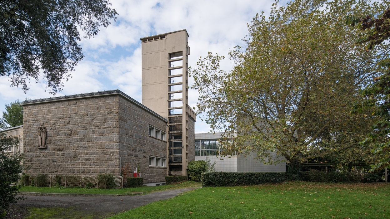 La cheminée monumentale, bâtiment B2 (externat). Louis Arretche, architecte. Bas-relief d'Antoniucci Volti. A l'arrière plan, le CDI construit postérieurement.Immatriculation