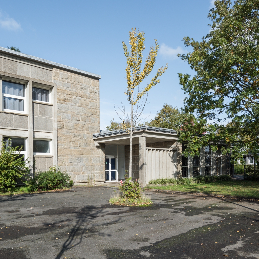 Externat B3 : façade sud et entrée. Noter les claustras en béton. Louis Arretche, architecte.Immatriculation