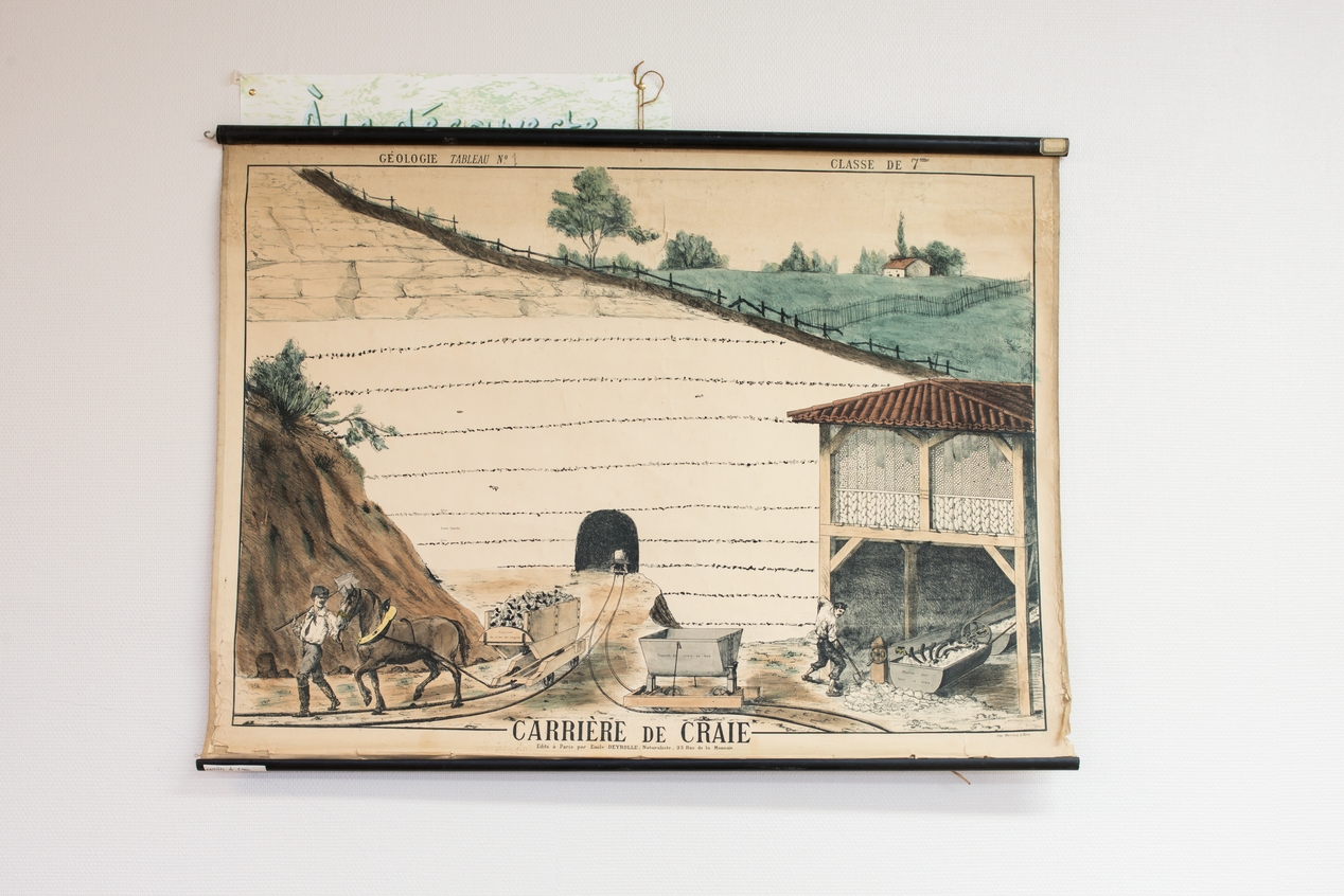 Carrière de craie, planche scolaire éditée par Emile Deyrolle et imprimée par Monrocq à Paris. Fin du 19e siècle (antérieure à 1888).Immatriculation
