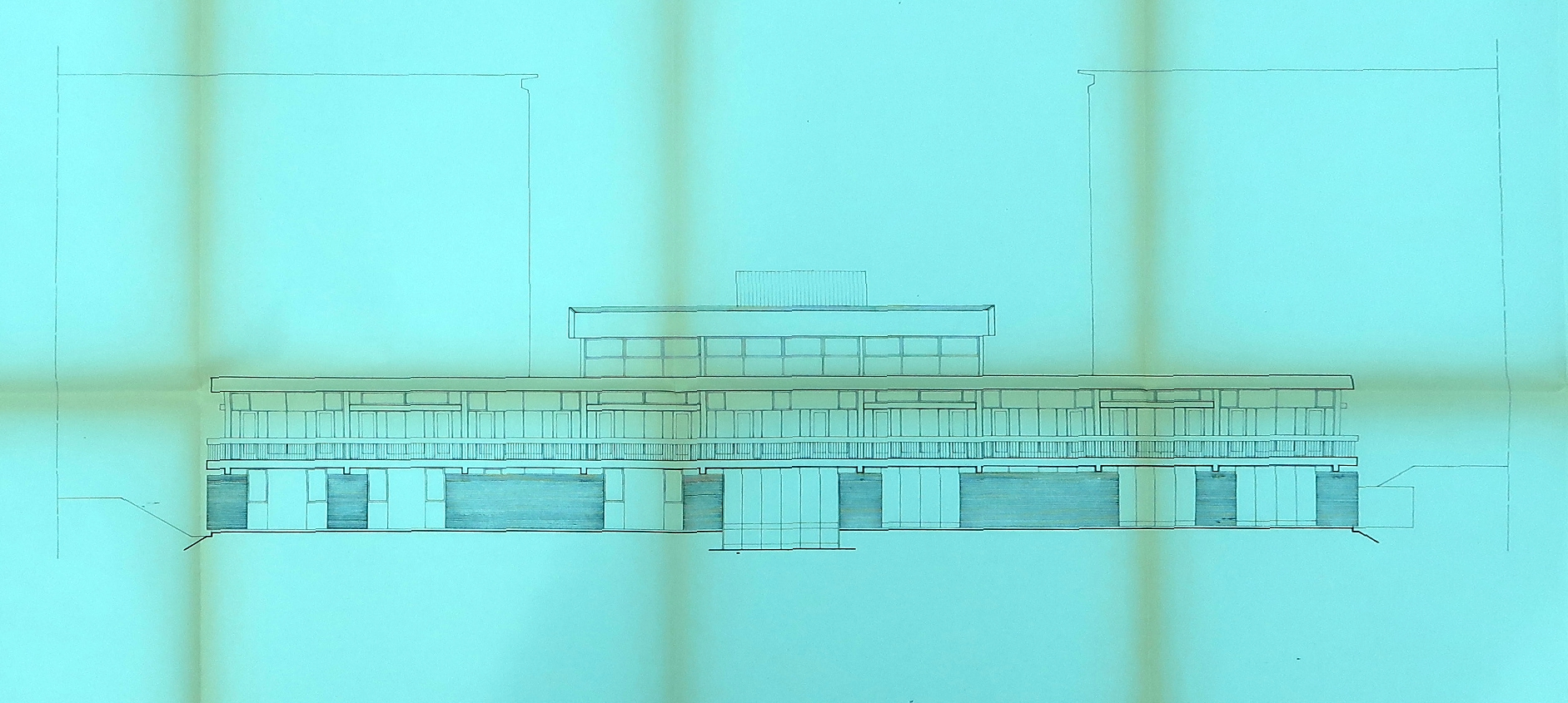 Restaurant, élévation de la façade sud, J. Monge et R. Guichebaron, architectes, 1964.Immatriculation