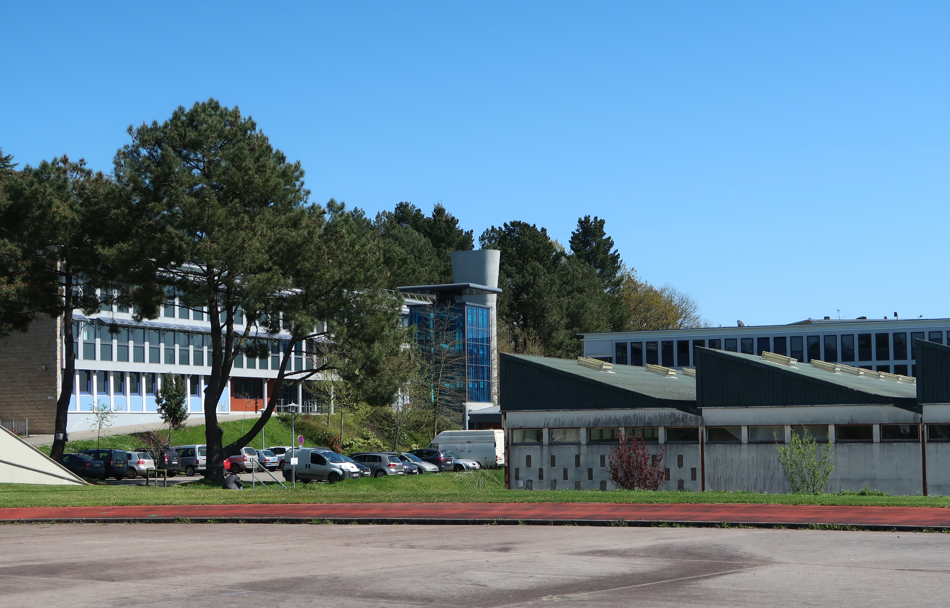 Façade du bâtiment D (externat), vue partielle des atelier (E) et à l'arrière façade du bâtiment C. Vue prise du plateau sportif.Immatriculation