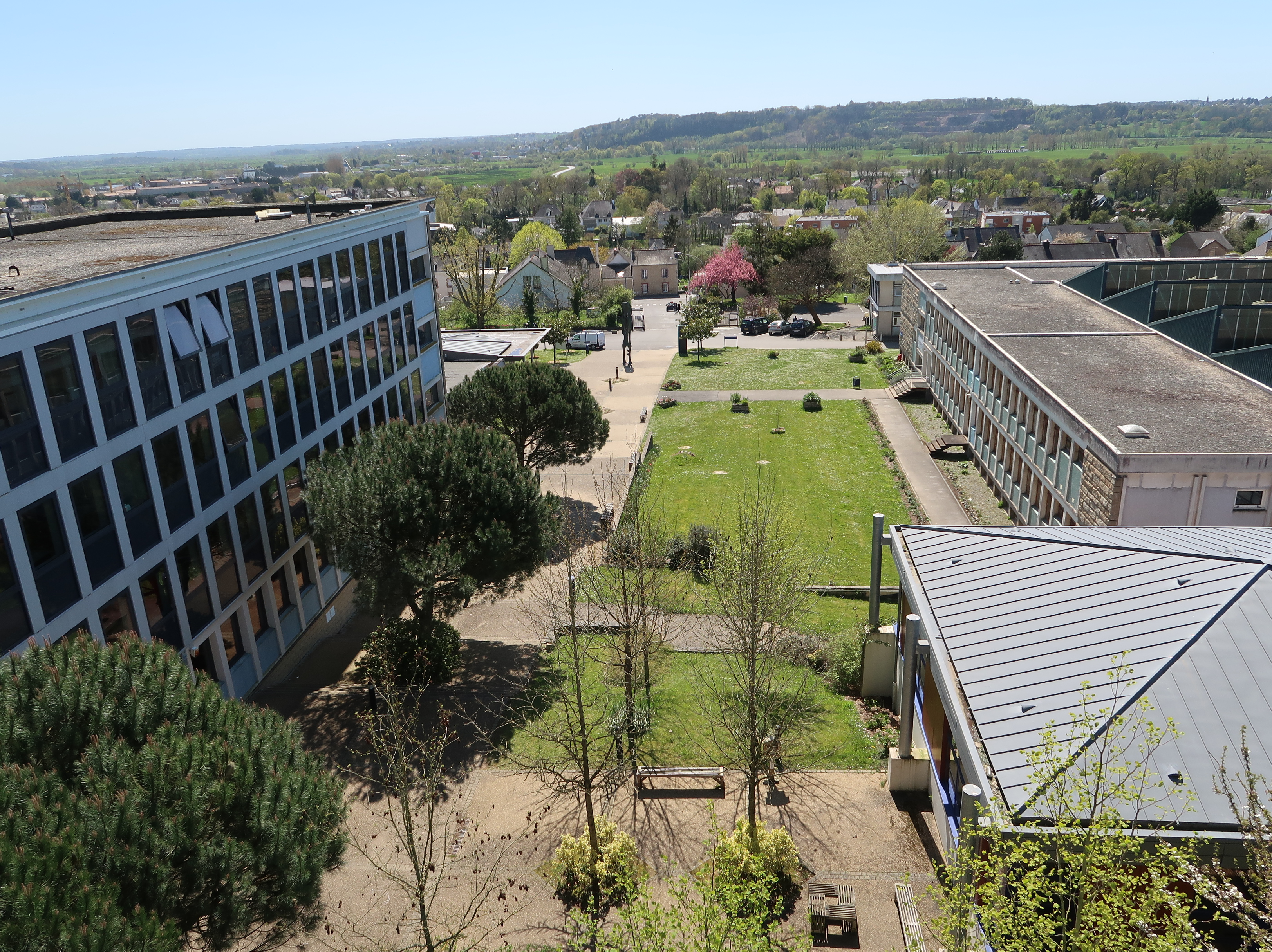 Vue de l'axe "central", prise du nord vers le sud, depuis le toit du bâtiment D. A gauche, l'externat C, à droite, la toiture du bâtiment E' et les ateliers.Immatriculation