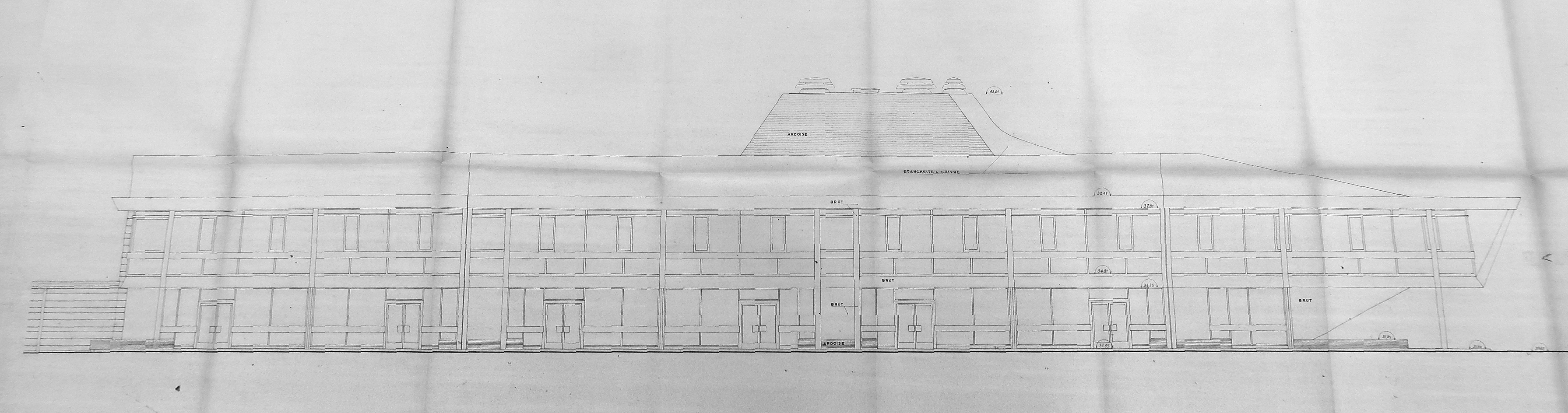 Réfectoire - cuisine, façade ouest, Louis Arretche, architecte, 1961.Immatriculation