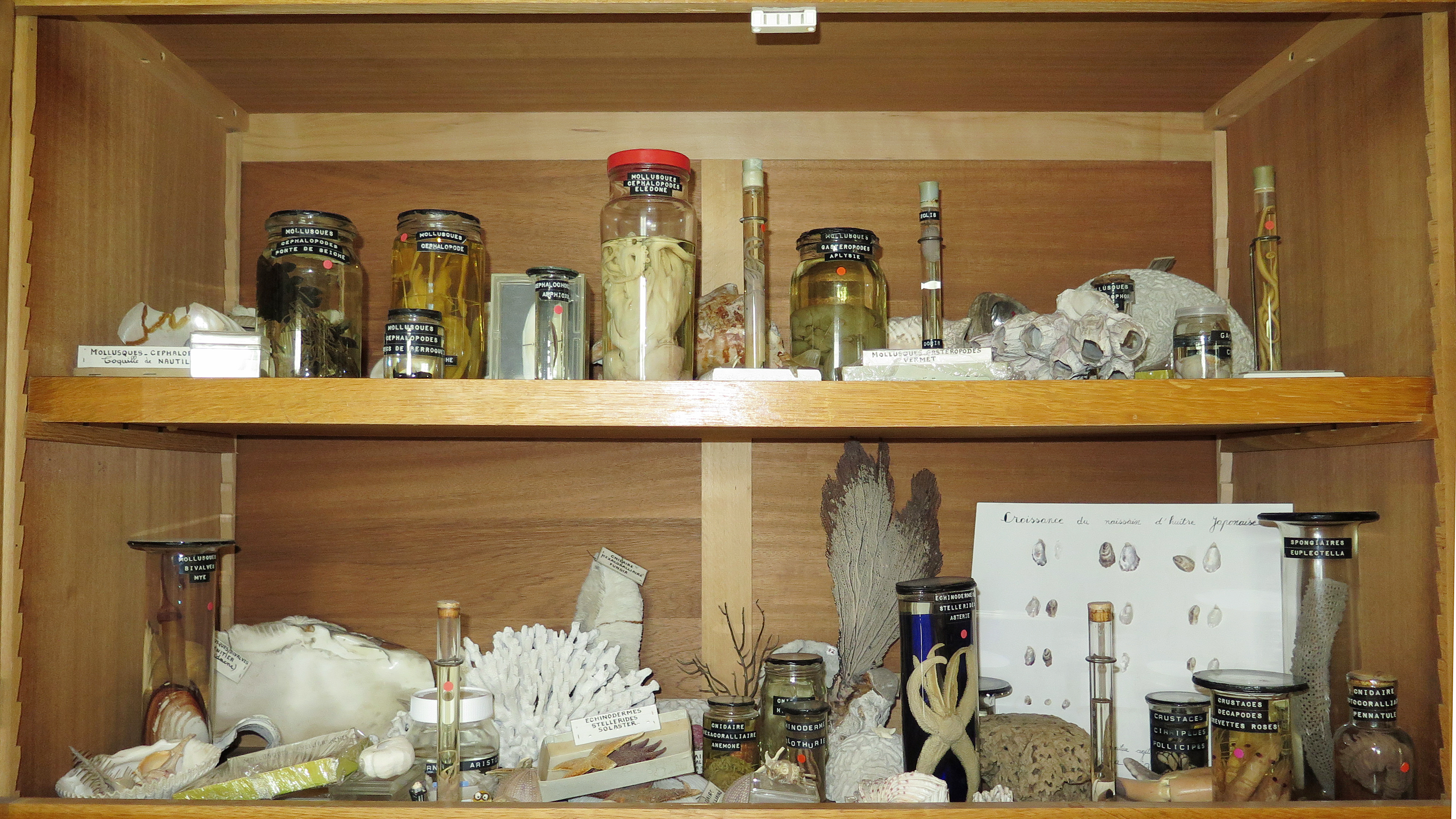 Vue d'ensemble d'une partie de la collection de zoologie : mollusques, crustacés, étoiles de mer, éponges et anémonesImmatriculation