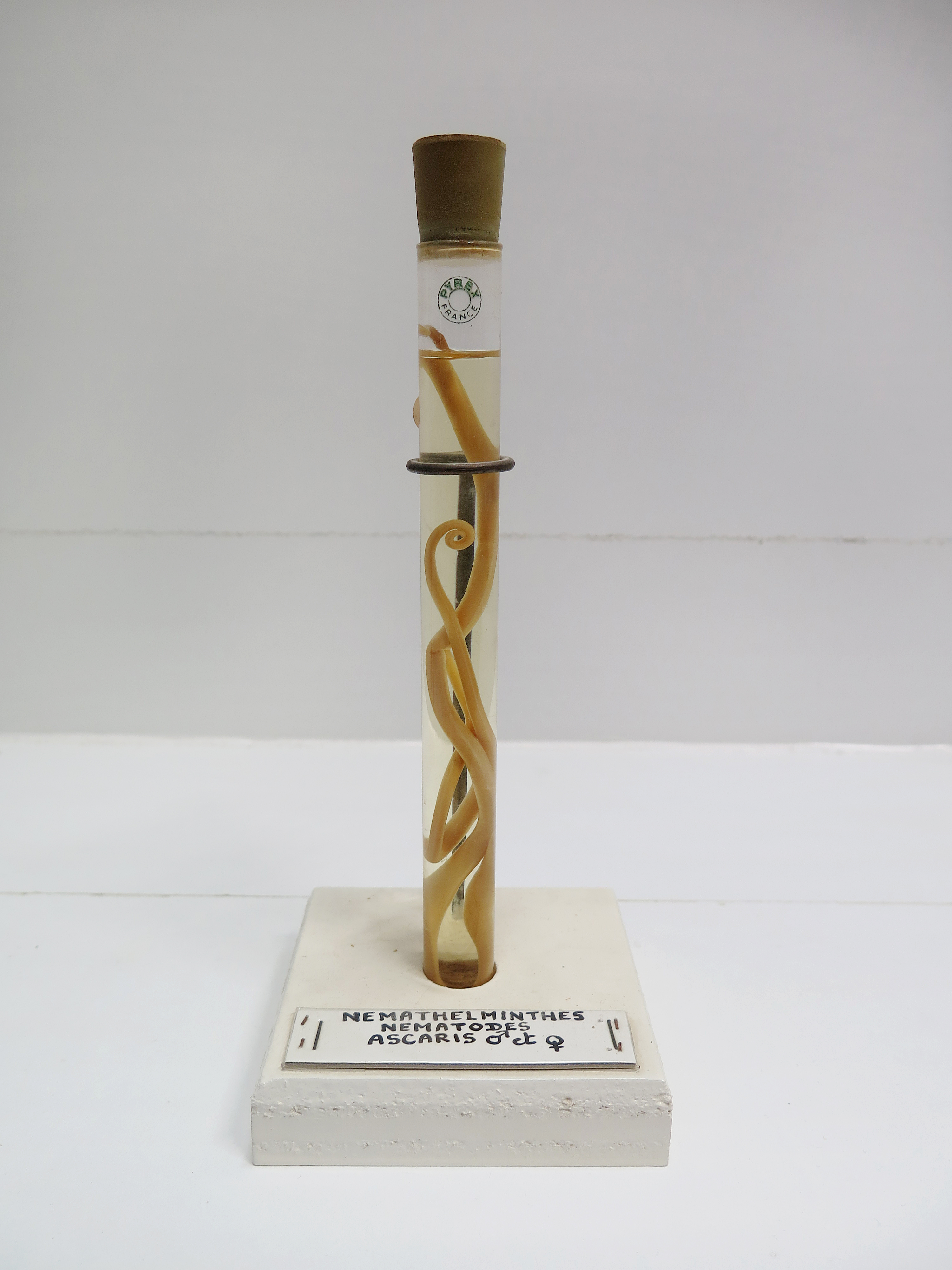 Fiole en verre contenant des ascaris (mâle et femelle) - Zoologie - Embranchement des vers