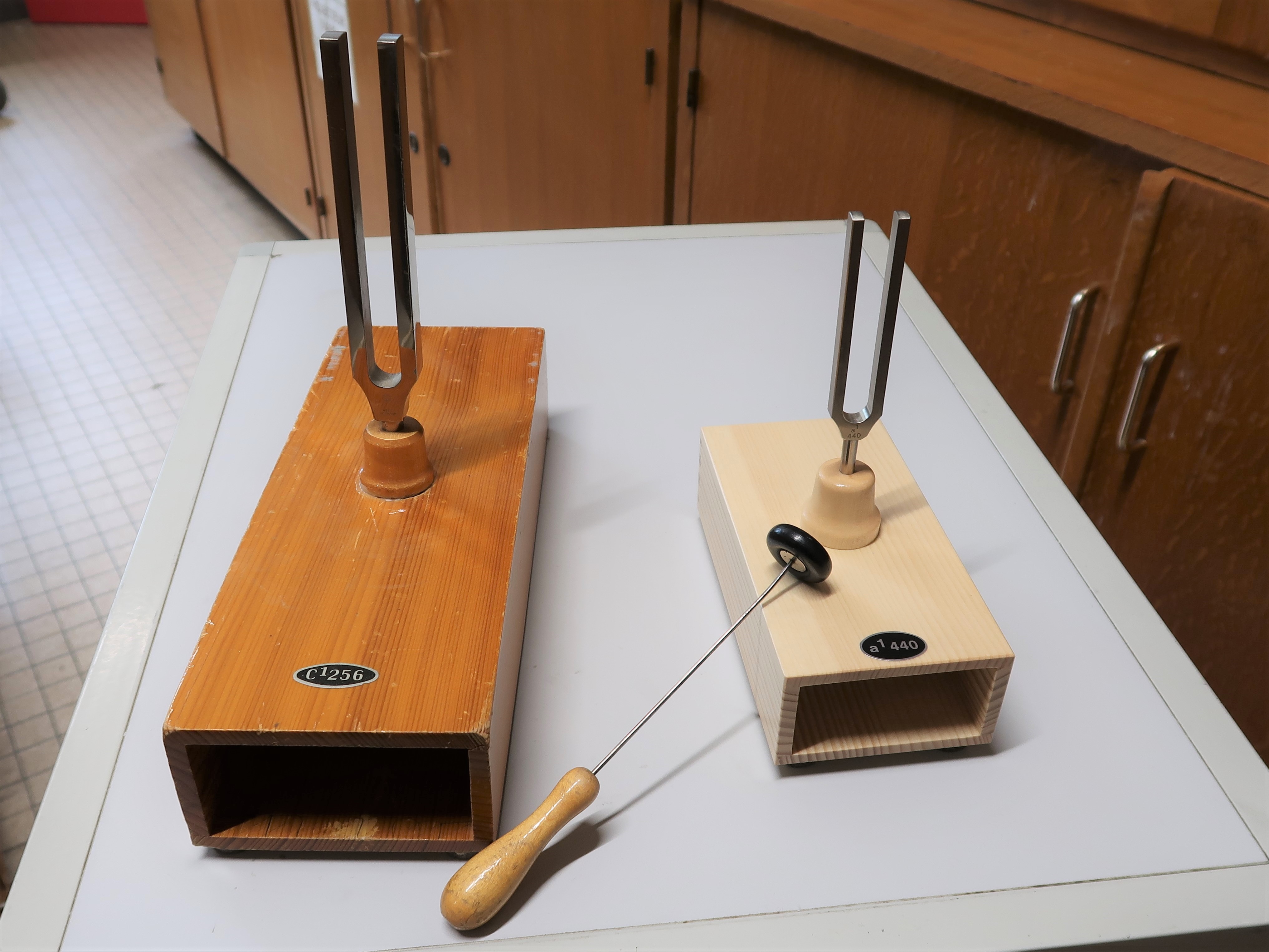 Ensemble de 2 diapason et d’une mailloche - Acoustique-Vibration (Jeulin, 20e siècle)Immatriculation