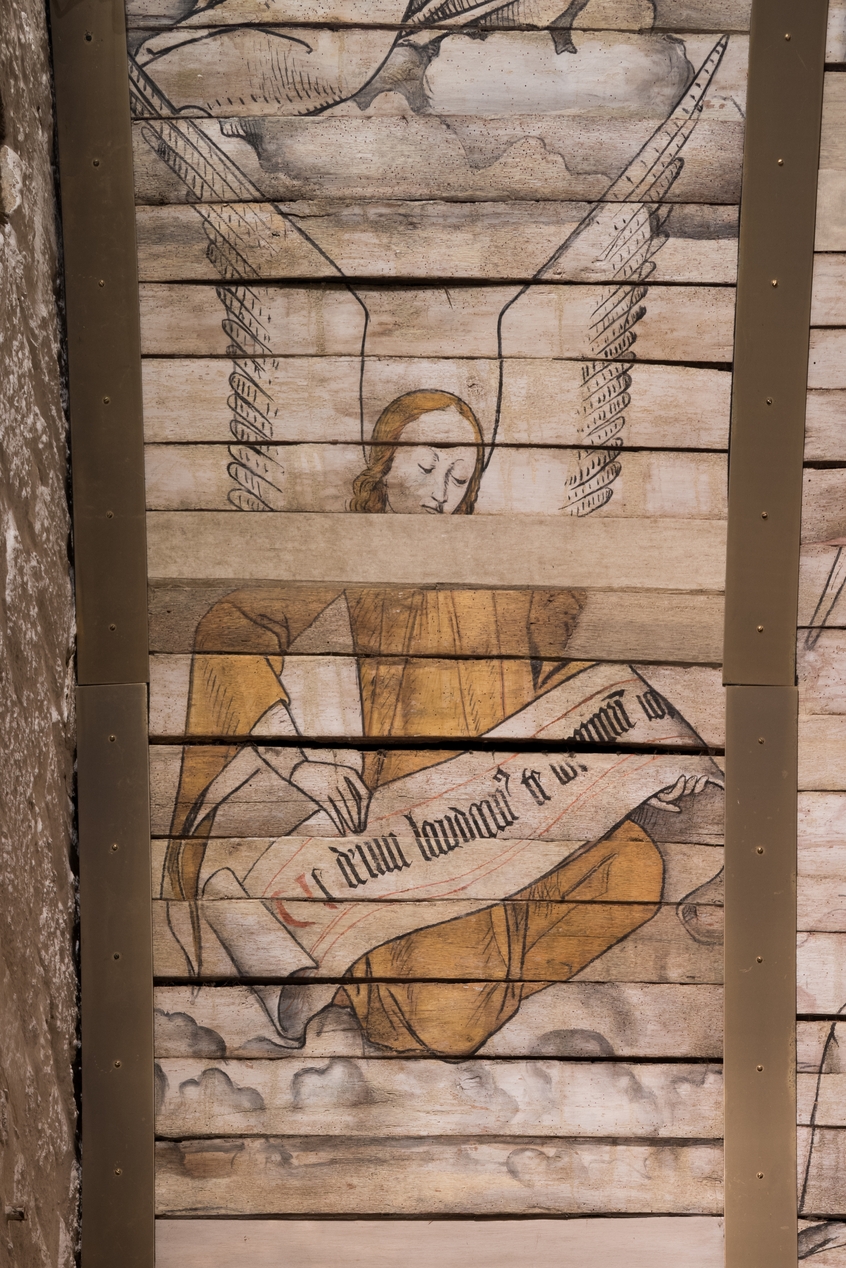 Lambris du XVème siècle. Ange avec la partition du Te Deum. Mur nord, registre médianImmatriculation
