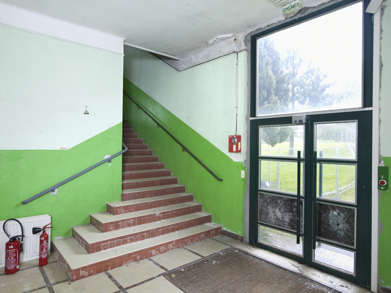 Cage d'escalier nord-ouest, internat de garçons (1954), désaffecté. Palier du rez-de-chaussée, amorce de l'escalier, porte d'entrée. Les matériaux d'origine ont été conservés, y compris pour le second œuvre.Immatriculation