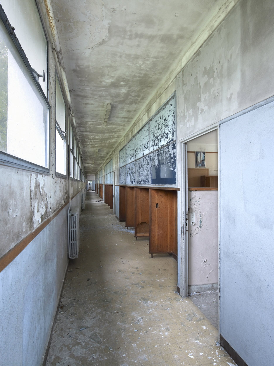 Externat n°2 (désaffecté), couloir de desserte latéral, le long de la façade nord-ouest. On aperçoit les baies hautes, dans la cloison des salles, qui permettaient à la lumière naturelle de pénétrer de deux côtés ainsi que le renfoncement des "vestiaires".Immatriculation
