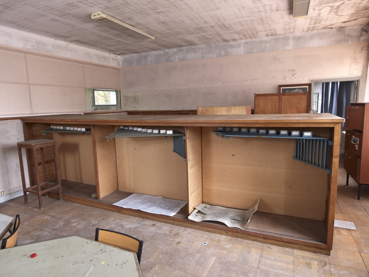Externat désaffecté : salle de classe qui a servi de laboratoire ou de salle des professeurs : meubles à planches murales.Immatriculation