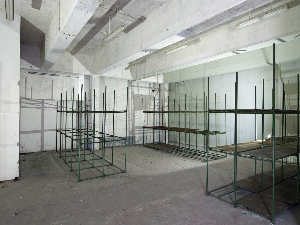 Vue d'un magasin situé au rez-de-chaussée. Il conserve des étagères tubulairesImmatriculation
