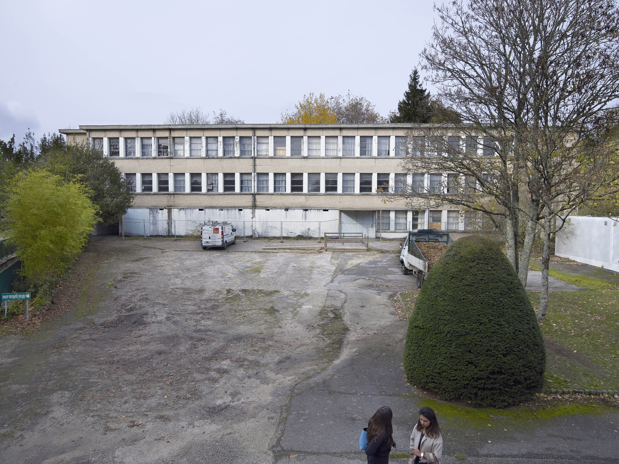 Vue d'ensemble de la façade arrière (sud-est) d'un externat désaffecté.Immatriculation