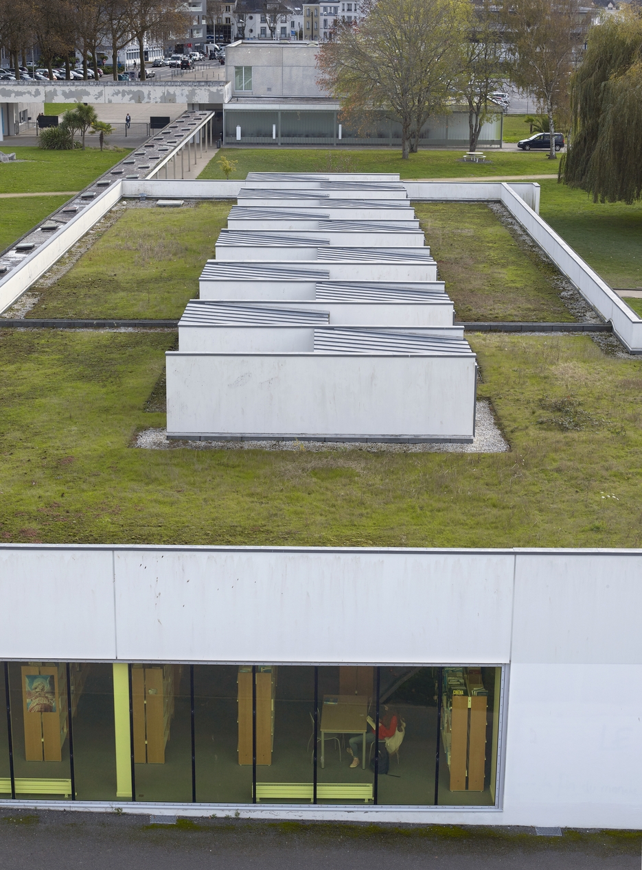 Toitures et baies de l'étage du CDI (P. Debard et S. Bertic, architectes, ca. 2005).Immatriculation