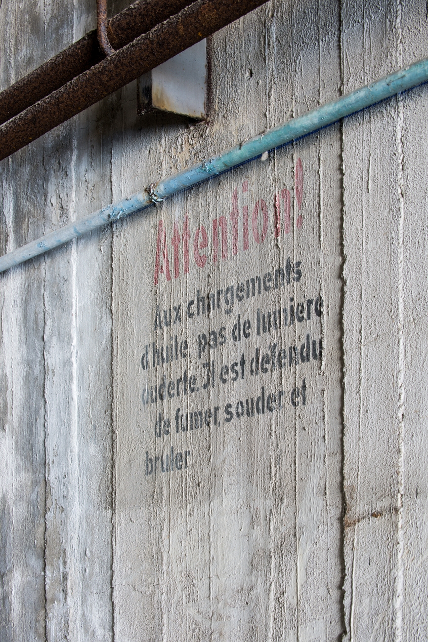 Vue d'une consigne de sécurité située sur le quai : Attention ! (en rouge) Aux chargements d'huile pas de lumière oud[v]erte. J[I]l est défendu de fumer, souder et bruler (en noir)Immatriculation