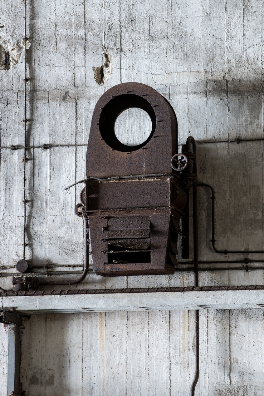 Vue d'un élément du système de chauffage et de ventilation fixé sur le mur de l'alvéole sud (emplacement pour un ventilateur en haut, un échangeur au milieu et une bouche de soufflage à lame en bas)Immatriculation