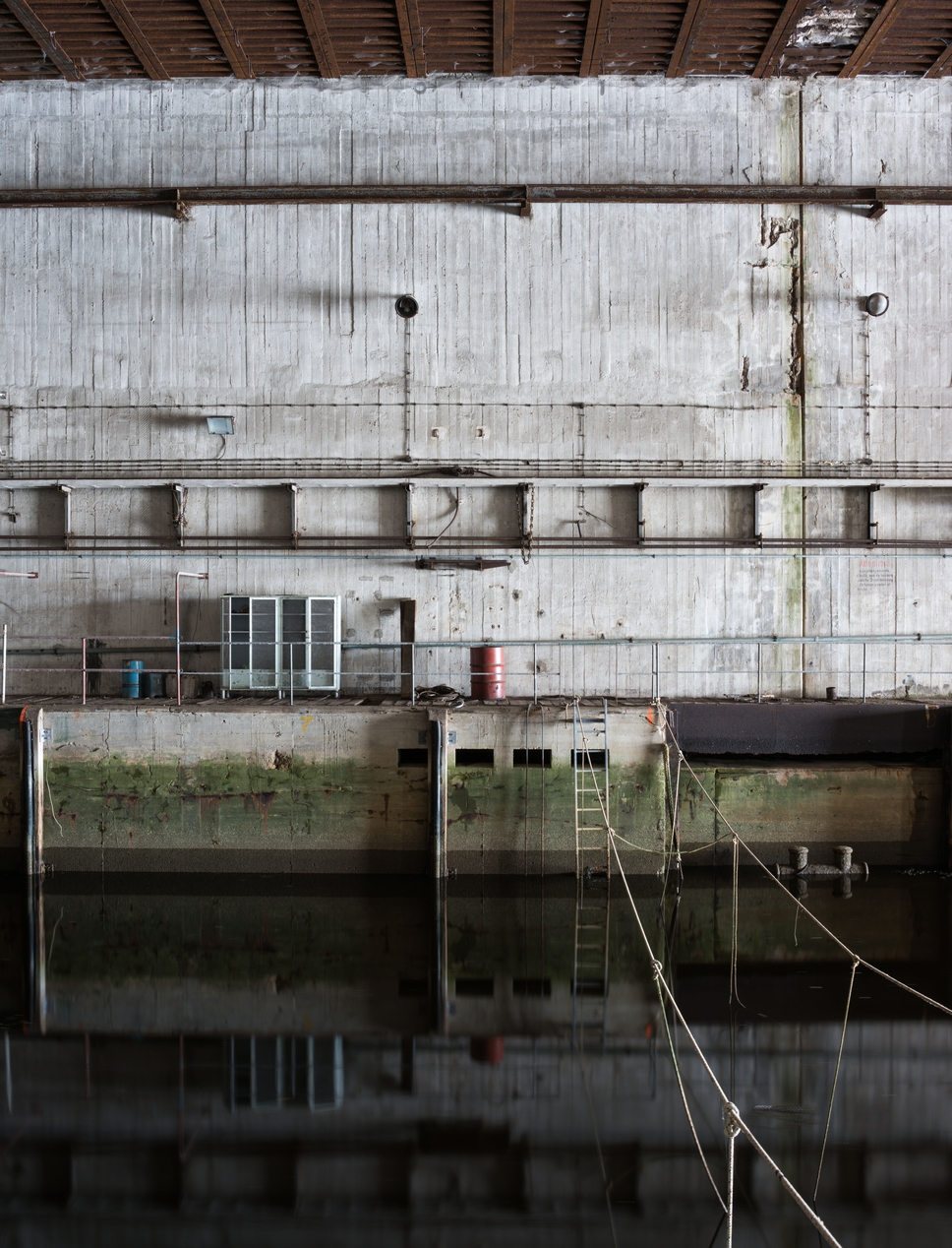 Vue de l'alvéole sud : emplacement de l'un des postes d’amarrage flottant (il est en partie coulé : seul le taquet émerge). Sur le mur, chemin de câble et lampes murales. En haut, chemin de roulement du pontImmatriculation