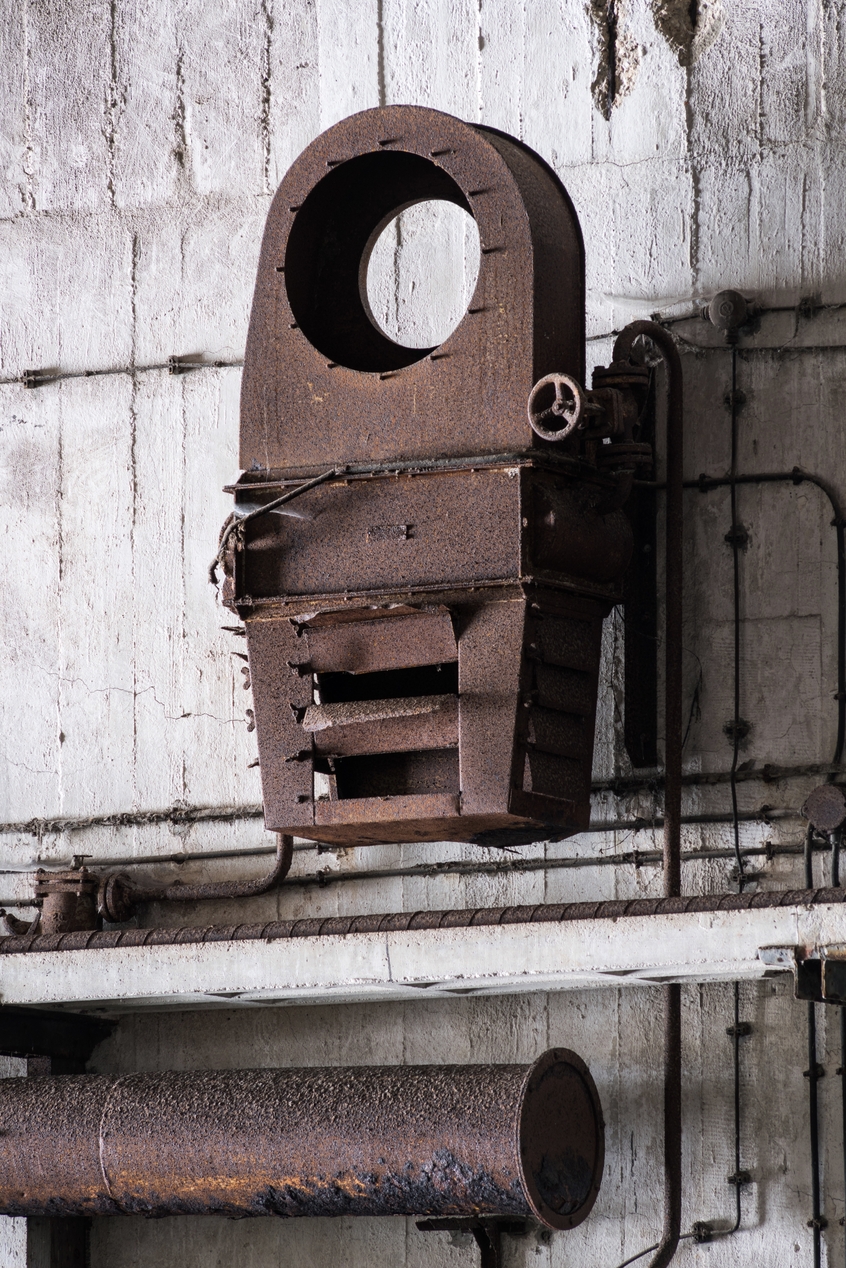 Vue d'un élément du système de chauffage et de ventilation fixé sur le mur nord de l'alvéole nord (emplacement pour un ventilateur en haut, un échangeur au milieu et une bouche de soufflage à lame en bas)Immatriculation