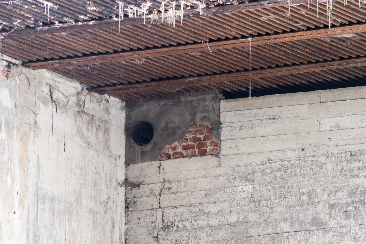 Vue d'un tuyau aménagé dans un angle au niveau du plafond. On aperçoit le remplissage en briqueImmatriculation