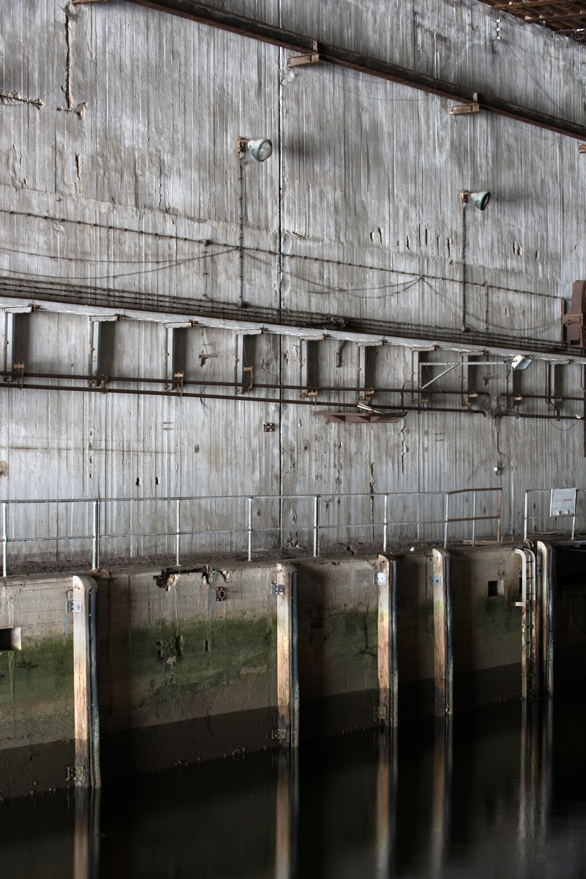 Vue de l'une des deux alvéoles : défenses de quai en bois. Sur le mur, chemin de câble et lampes muralesImmatriculation