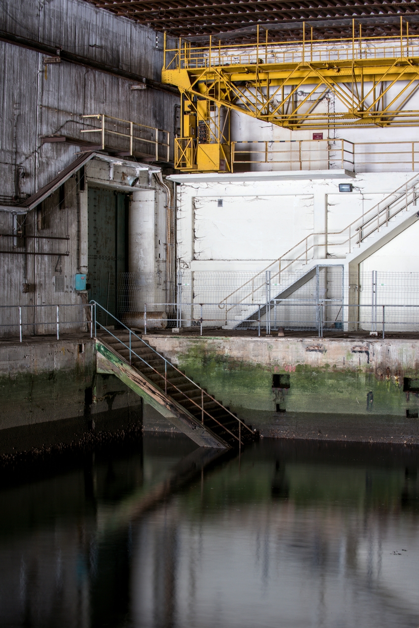 Vue du fond de l'alvéole nord (dans le renfoncement du mur, la porte blindée nord) : deux escaliers disposés en vis à vis permettent d'accéder au bassin à marée basse. Peint en blanc, un troisième escalier donne accès au premier étage. En jaune, le pont roulant Levman arrêté au-dessus de l'avancée du premier étageImmatriculation