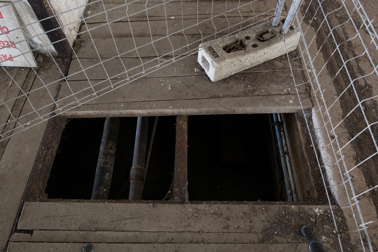 Vue des tuyaux qui passent sous le platelage en bois de la rue. Les fluides étaient destinés à avitailler les sous-marins à quaiImmatriculation