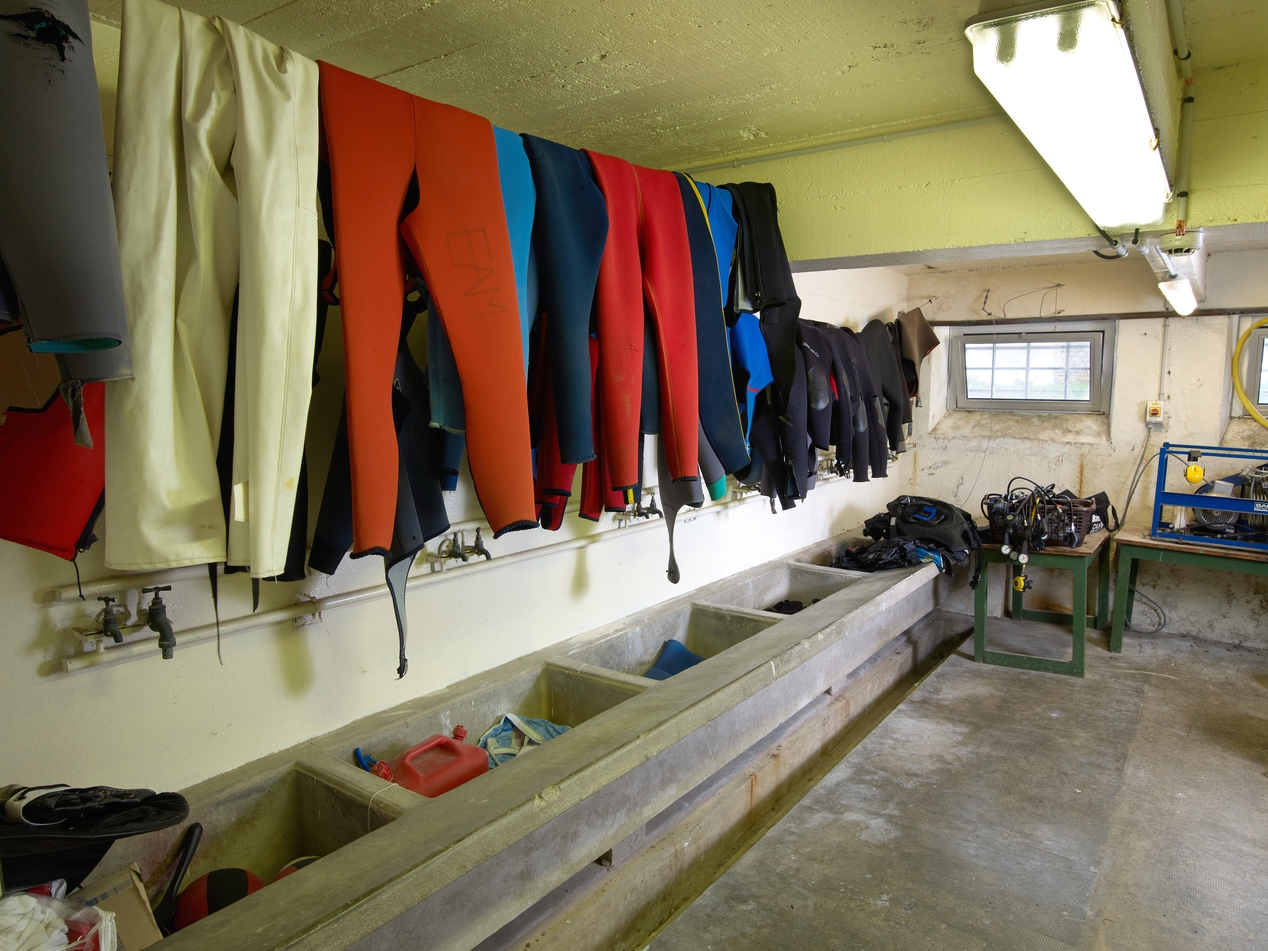 Vestiaire : séchage des combinaisons de plongée.Immatriculation