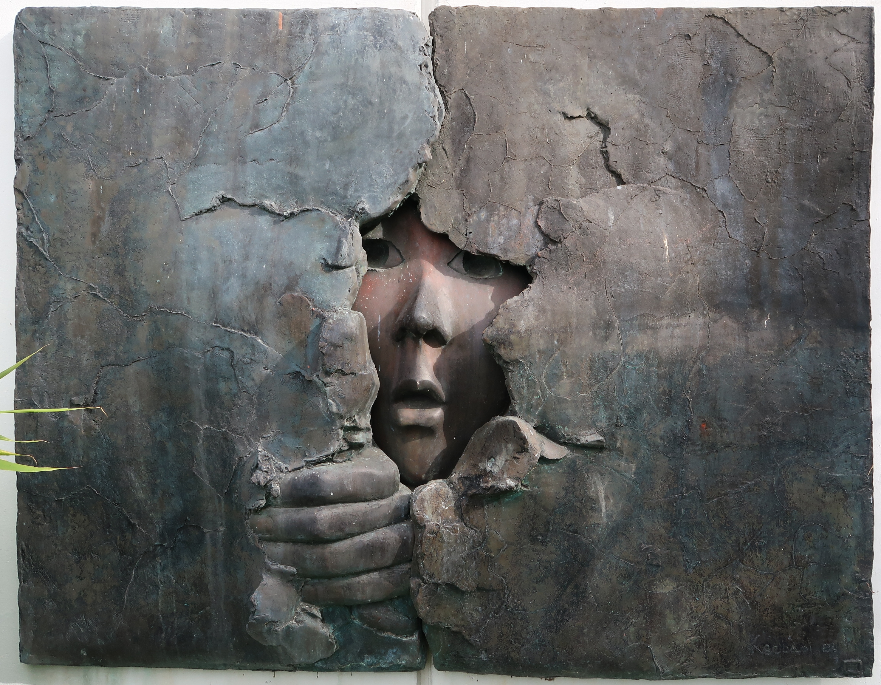 Bas relief en bronze de Martine Kerbaol : "Découverte", 1982. Décoration au titre du 1% artistique.Immatriculation