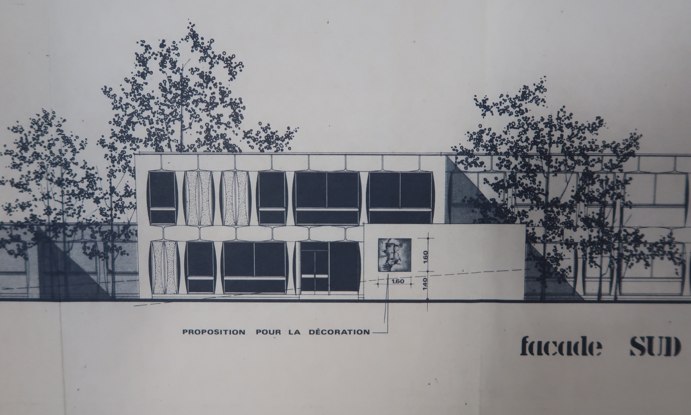 Détail sur l'entrée de l'administration et l’œuvre du 1% (Élévation de la façade sud du lycée, Yves Guillou, architecte, 1981)Immatriculation