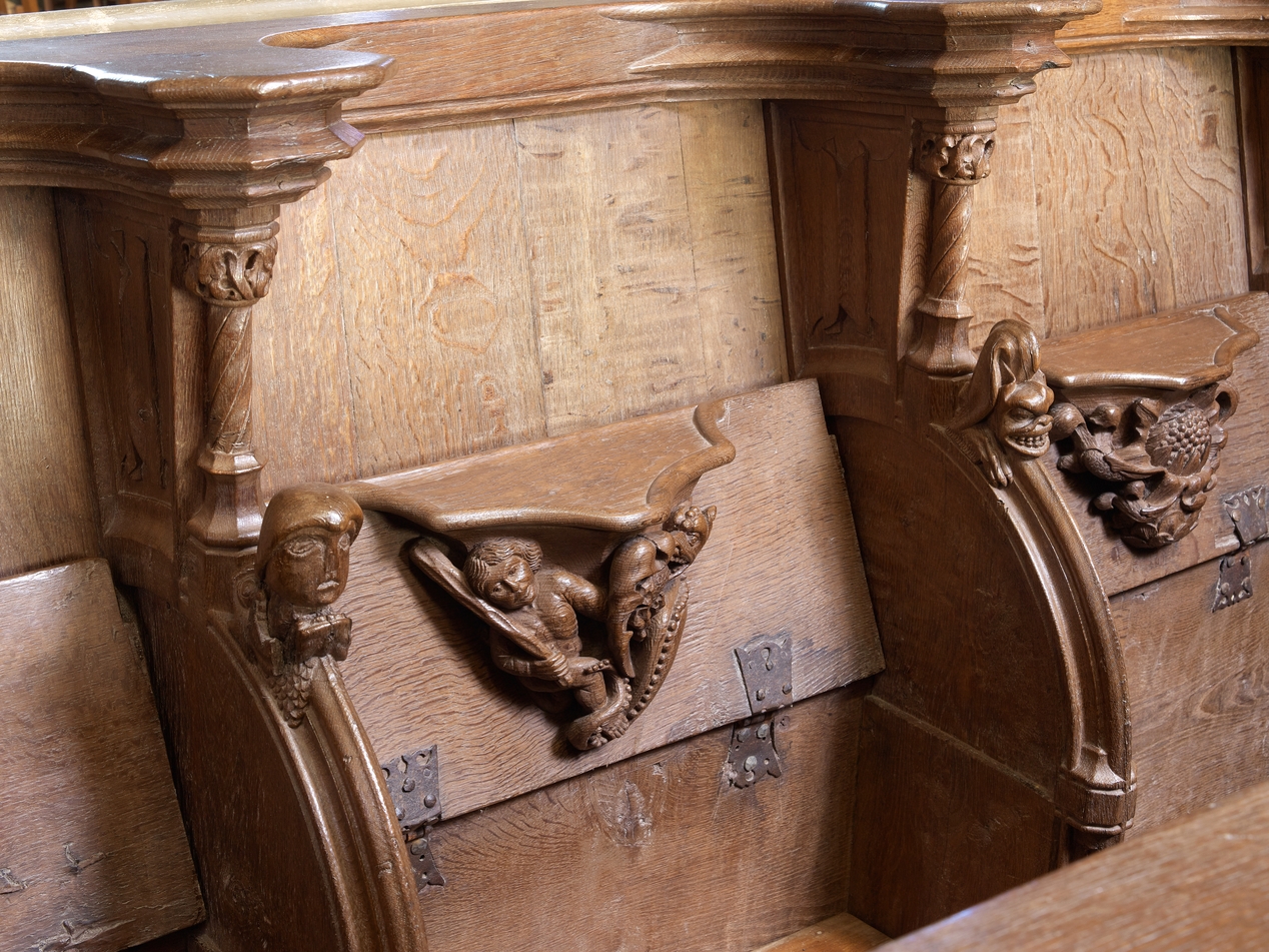 Détail des stalles : combat entre un homme sauvage armé d'un baton et un dragonImmatriculation