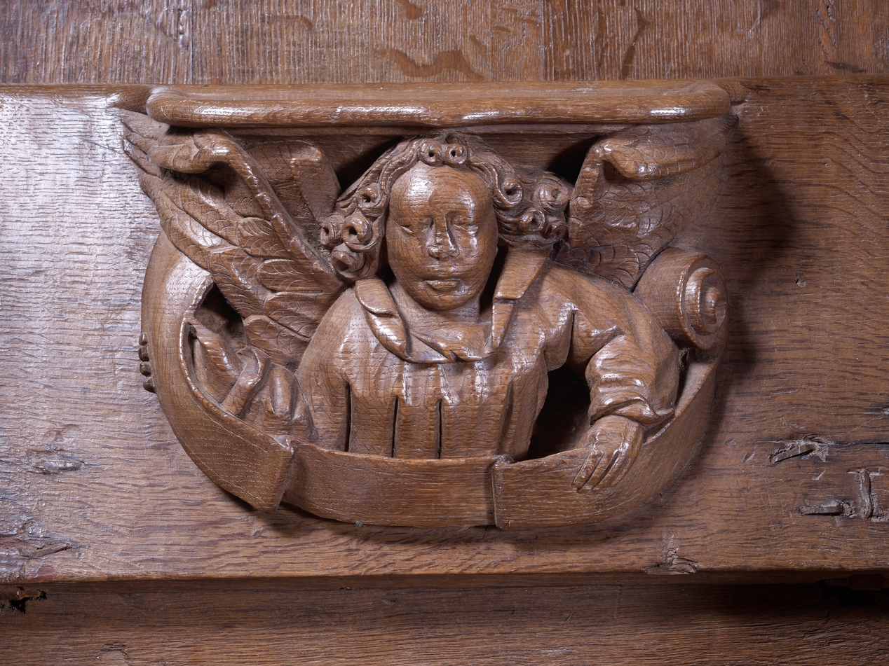 Détail de l'une des stalles : ange et phylactèreImmatriculation