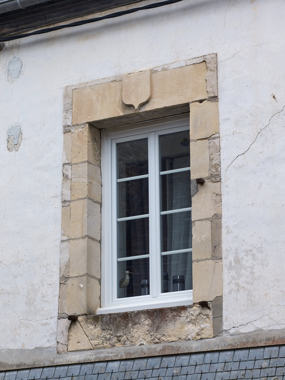 42 rue Renan. Maison du 17e siècle. Détail d'une baie du premier étage ornée d'un blason muets autrefois peintImmatriculation