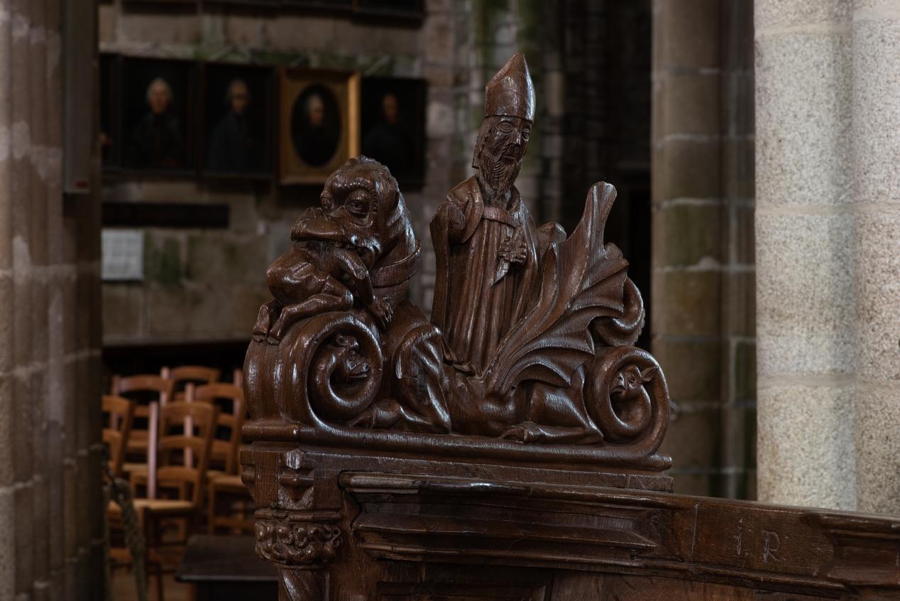 Rangs nord, détail de l'intérieur de la jouée ouest des stalles basses, représentation de saint Tugdual terrassant le dragonImmatriculation
