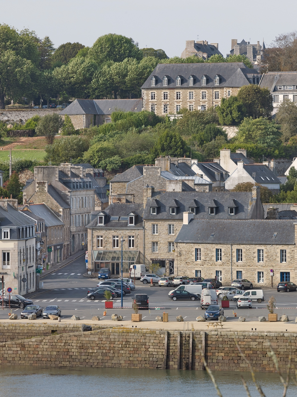 Tréguier : vue générale du port et du front portuaire, place du Général de Gaulle desservie à l'ouest par la rue Saint-André. Au premier plan, la caleImmatriculation