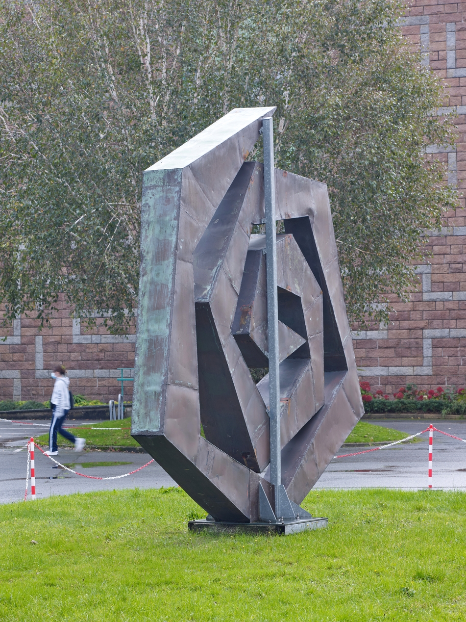 Soleil Celte. Sculpture de Georges Delahaie, en feuilles cuivre sur ossature d'acier, 1972. Vue de trois quarts, arrière, prise du nord-ouest. L'ossature a été modifiée.Immatriculation