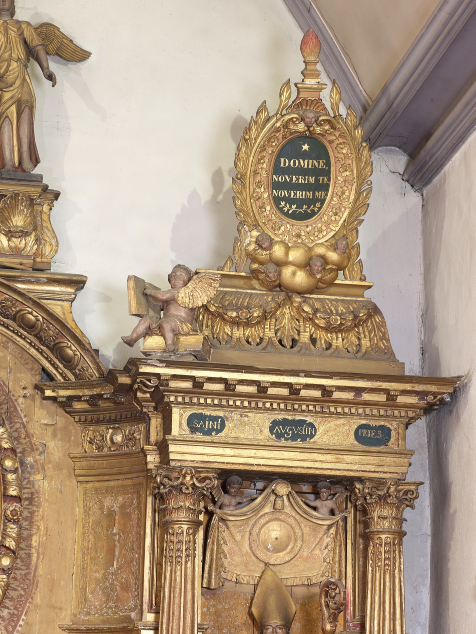 Retable. Détail de l'entablement et du couronnement orné d'éléments décoratifs (médaillon, pot à feu, angelot).Immatriculation