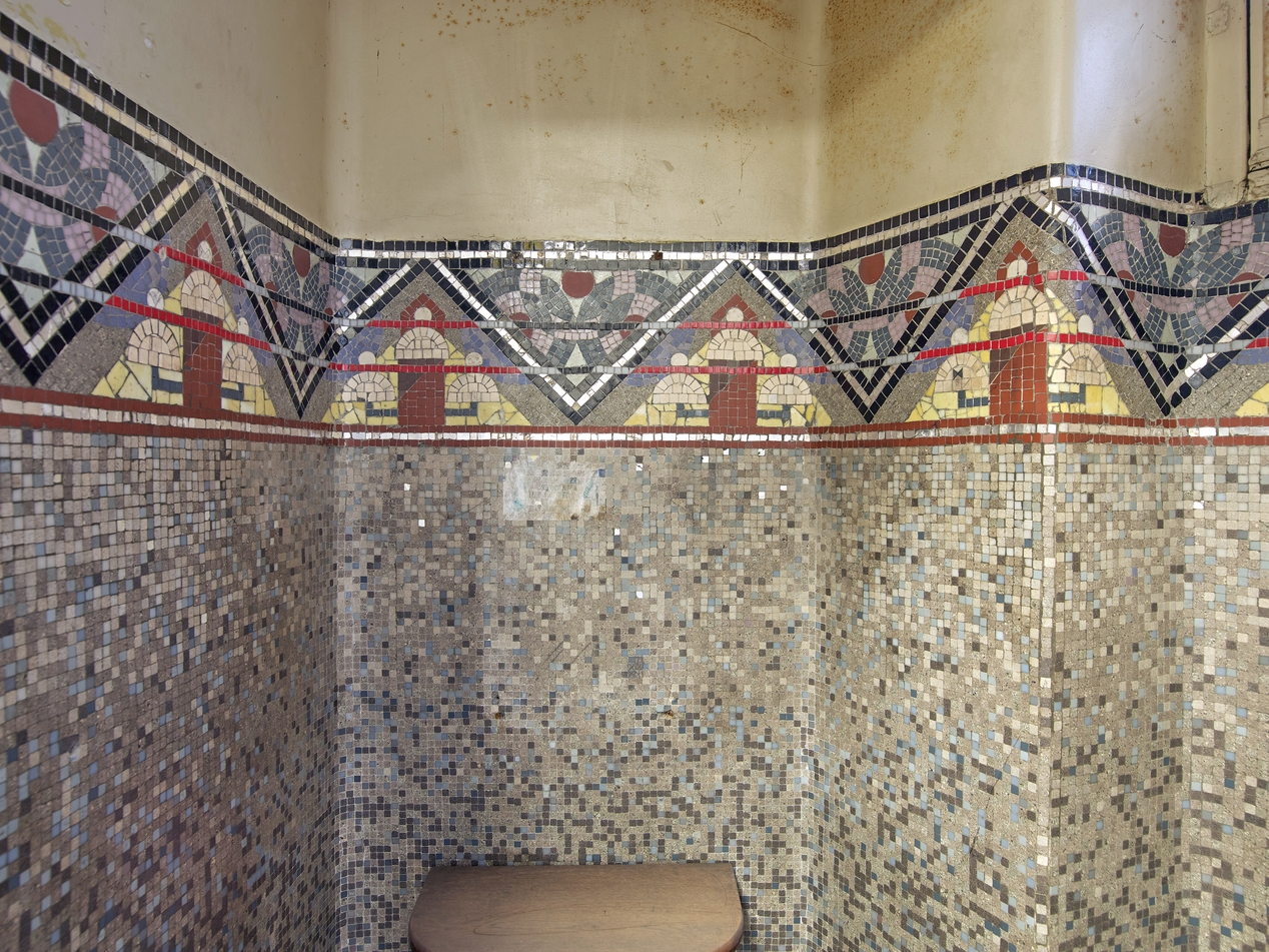 Intérieur d'une cabine téléphonique. Lambris de hauteur. Détail d'une frise de mosaïques à motifs géométriquesImmatriculation