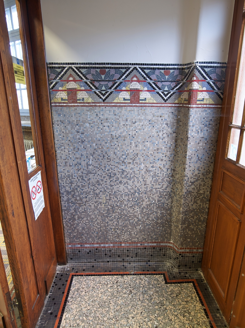 Sas d'entrée. Détail du lambris de hauteur en mosaïquesImmatriculation