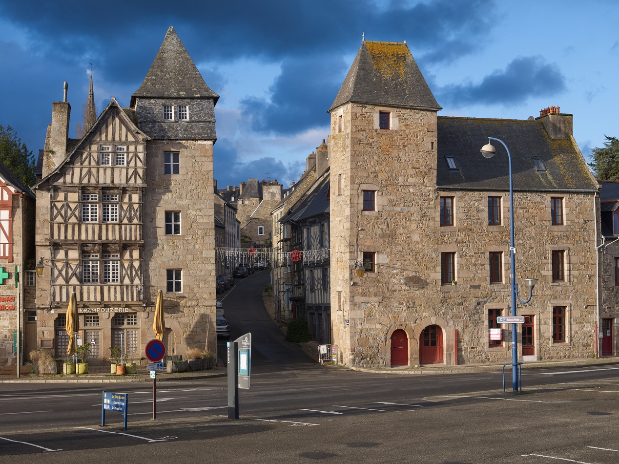 Tréguier : vue du port et de la Place Général de Gaulle. Les deux maisons situées de part et d’autre de la « Grande rue » (aujourd’hui rue Renan) et sur le quai du Jaudy sont nommées localement « porte de Tréguier »Immatriculation