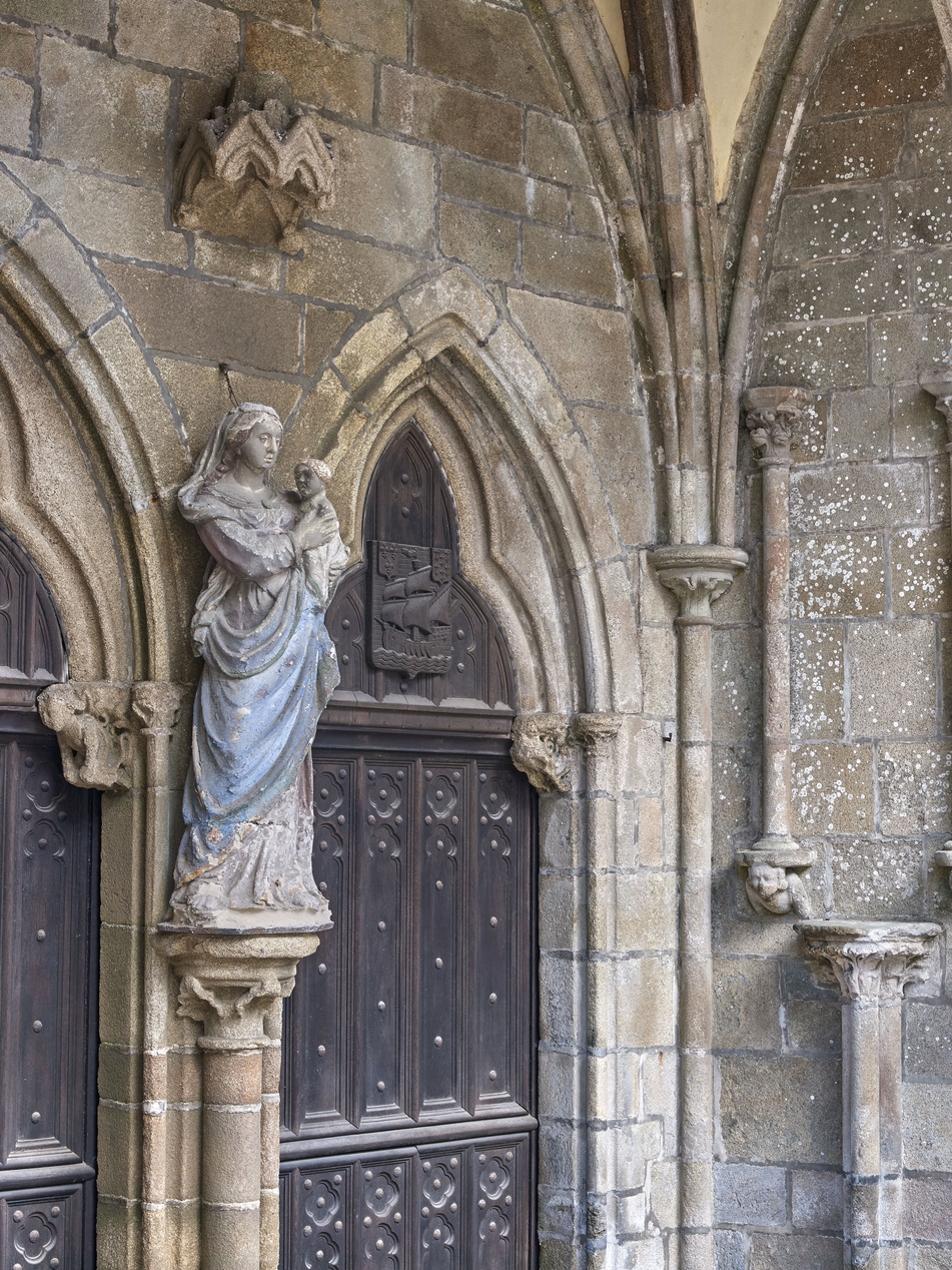 Cathédrale Saint-Tugdual, porche de la tour des cloches, Vierge à l'enfant. Sur la porte restaurée dans les années 1930, les armoiries de la ville de TréguierImmatriculation