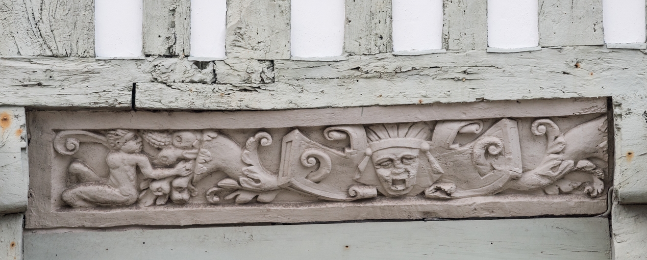 14 place du Martray. Maison à pans de bois de la fin du 16e siècle remaniée. Façade nord. Détail du décor Renaissance remployé (?)Immatriculation