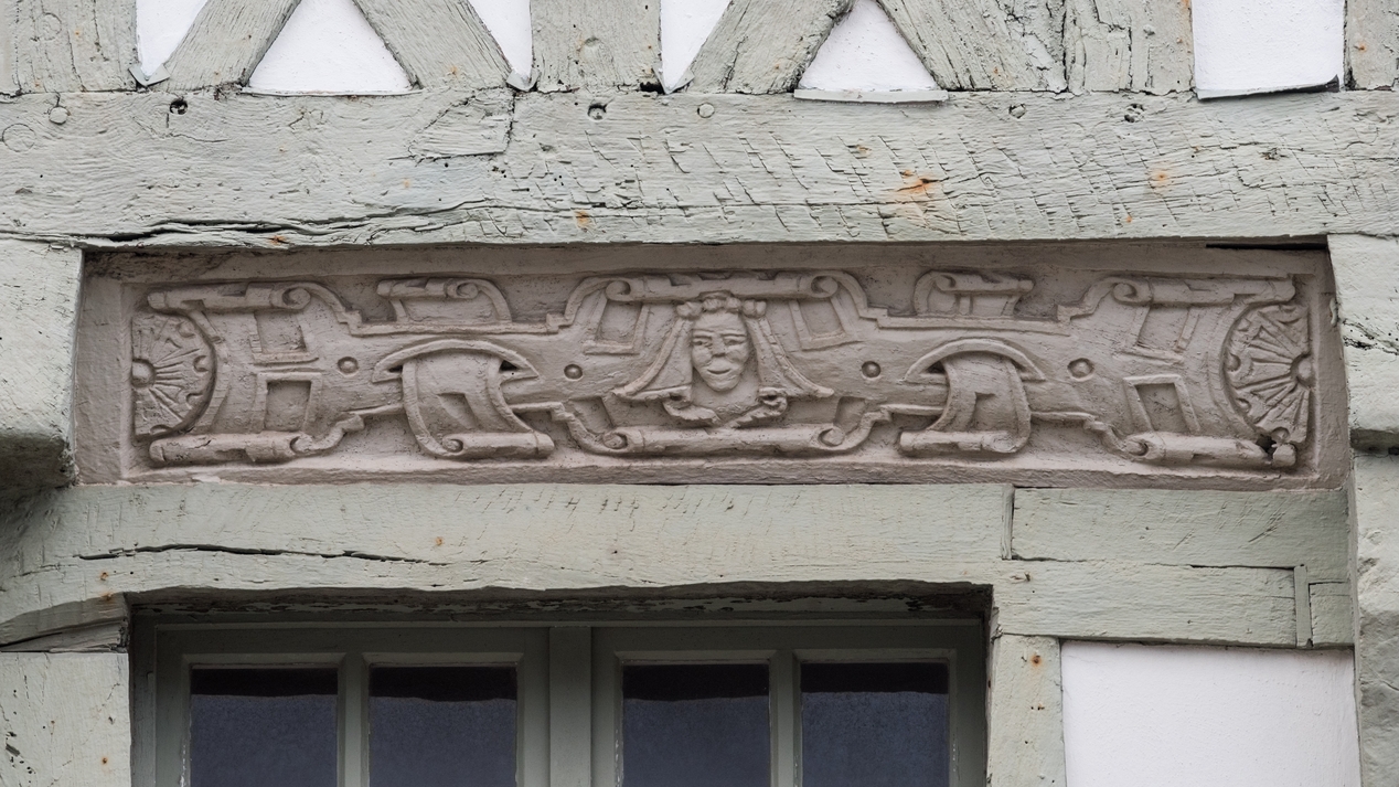 14 place du Martray. Maison à pans de bois de la fin du 16e siècle remanié. Façade nord. Détail du décor RenaissanceImmatriculation
