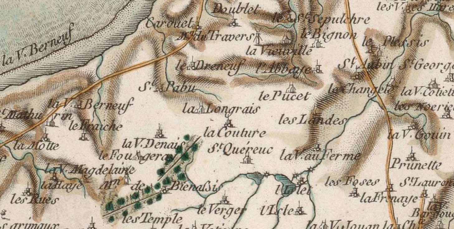 Vue de l’environnement de des granges de La Moinerie et de Saint-Quéreuc à la fin du 18e siècle, carte générale de la France. 156, [Tréguier]. N°156 / [établie sous la direction de César-François Cassini de Thury].