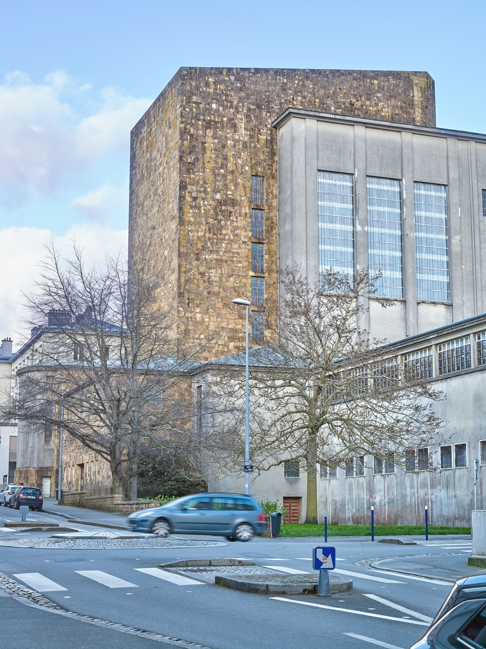 Eglise Saint-Louis, élévation est, matériaux différents (pierre de logonna, béton, verre), fonctions différentes (usage communautaire, fonction religieuse)Immatriculation