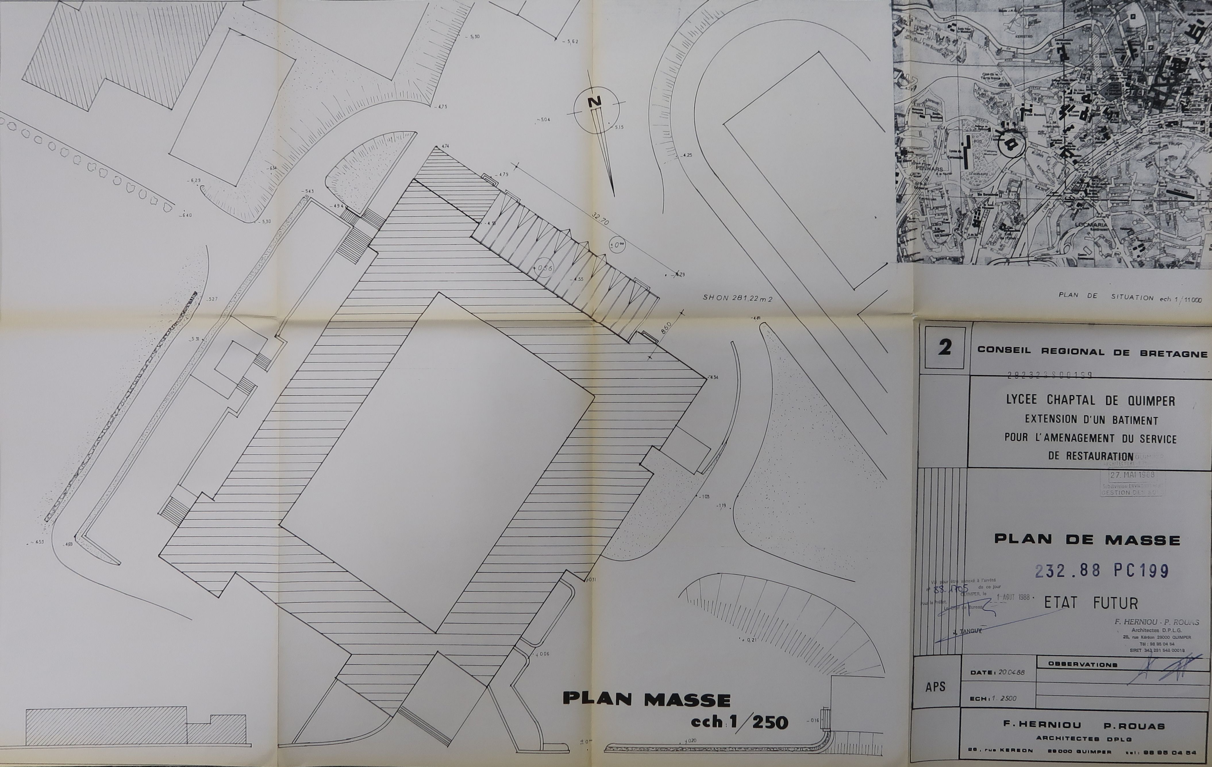 Extension d'un bâtiment pour l'aménagement du service de restauration. Plan de masse. État futur. Franck Herniou et Pierre Rouas, architectes, 1988.Immatriculation