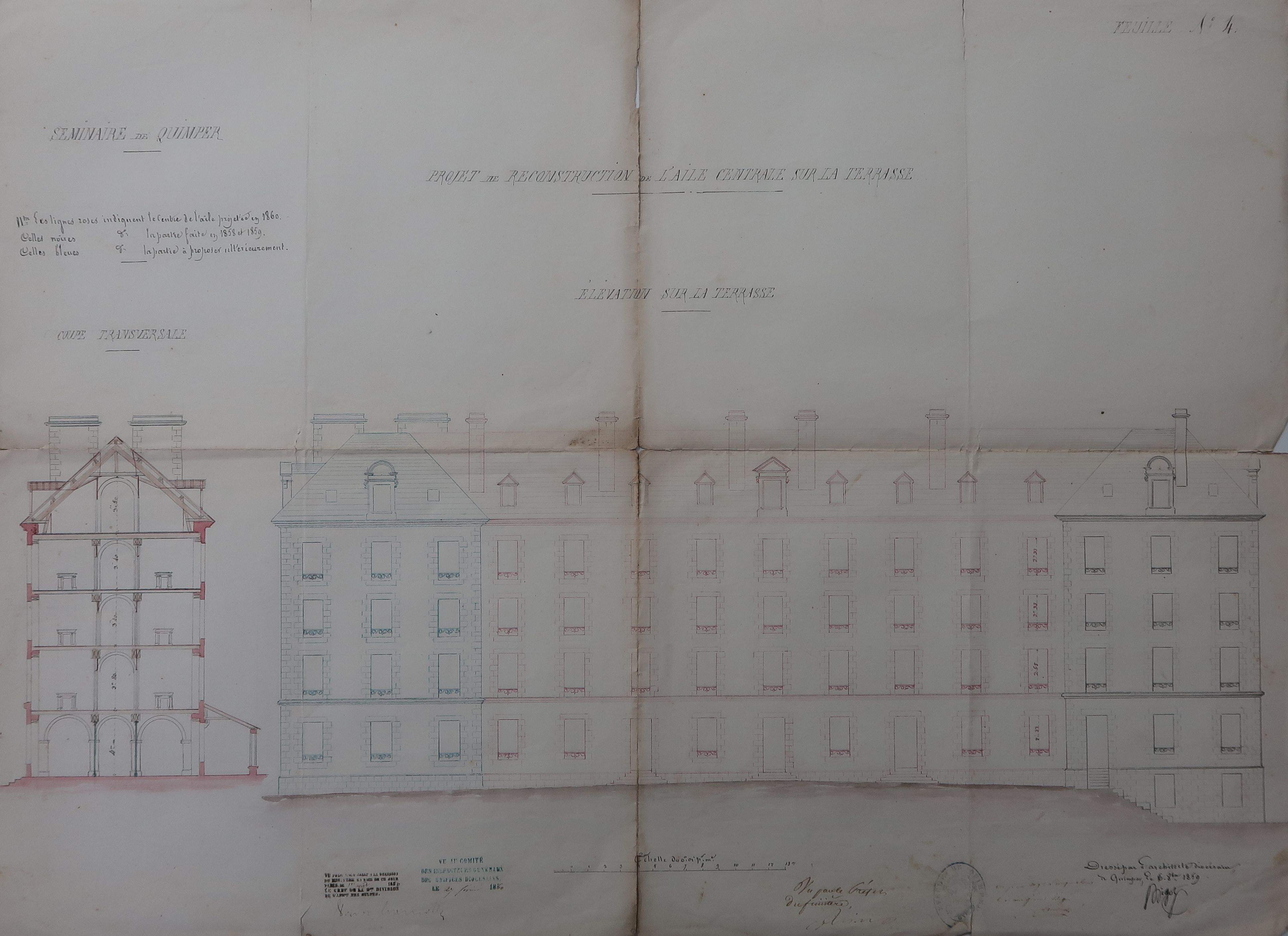 Coupe et élévation de l'aile sud-est, "vu par le comité des inspecteurs des édifices diocésains", en 1860. Joseph Bigot , architecte.Immatriculation