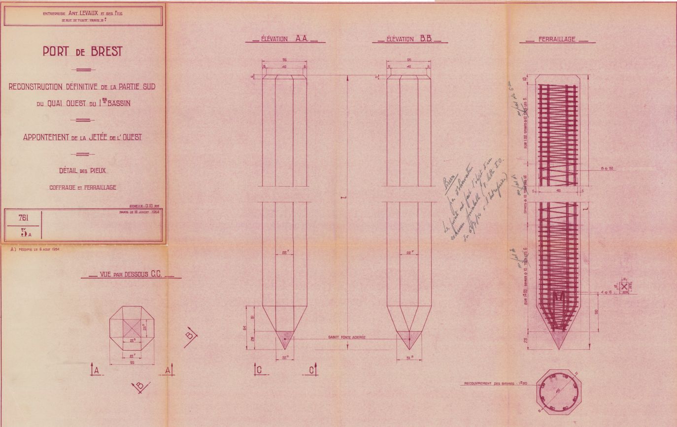 Plan 761_5A, Port de Brest, reconstruction définitive de la partie sud du quai ouest du 1er bassin, appontement de la jetée ouest, détail des pieux, coffrage et ferraillage. Entreprise Ant, Levaux et fils, 12 juillet 1954.