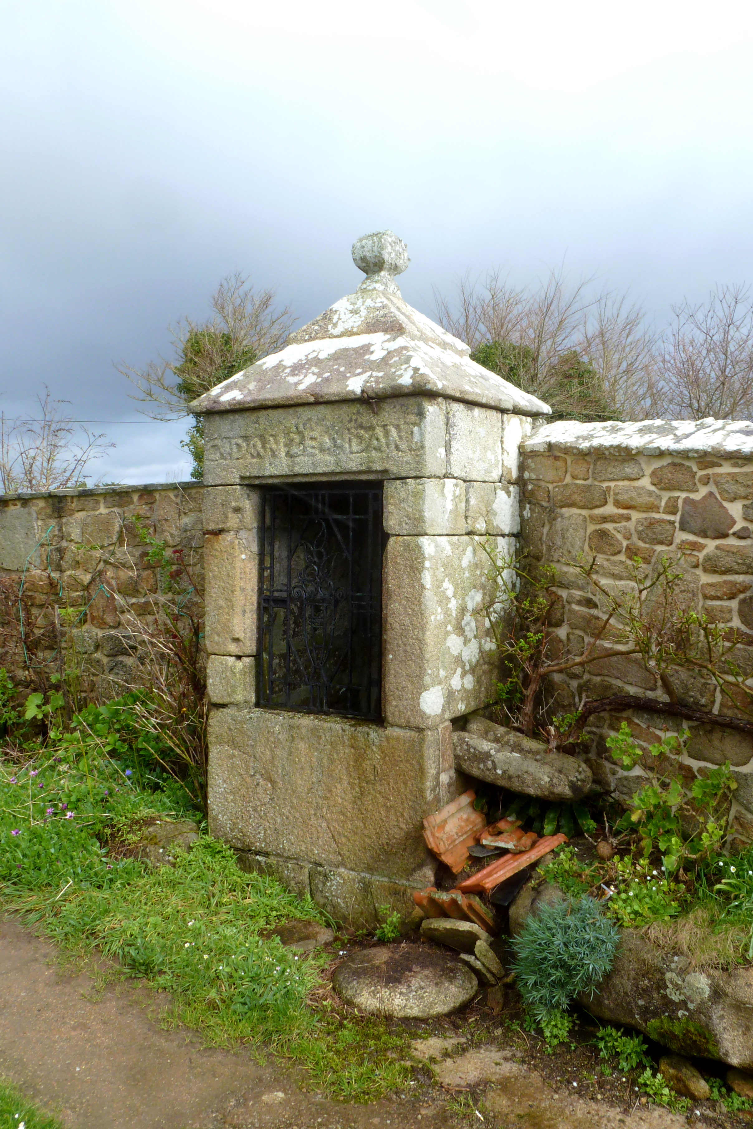 Puits daté 1774, vue générale prise du sud ouest. Inscriptions G : DANZE H : DANZE sur le linteau et pierre creuse pour écoulement de l'eau dans l'auge. (2020)Immatriculation