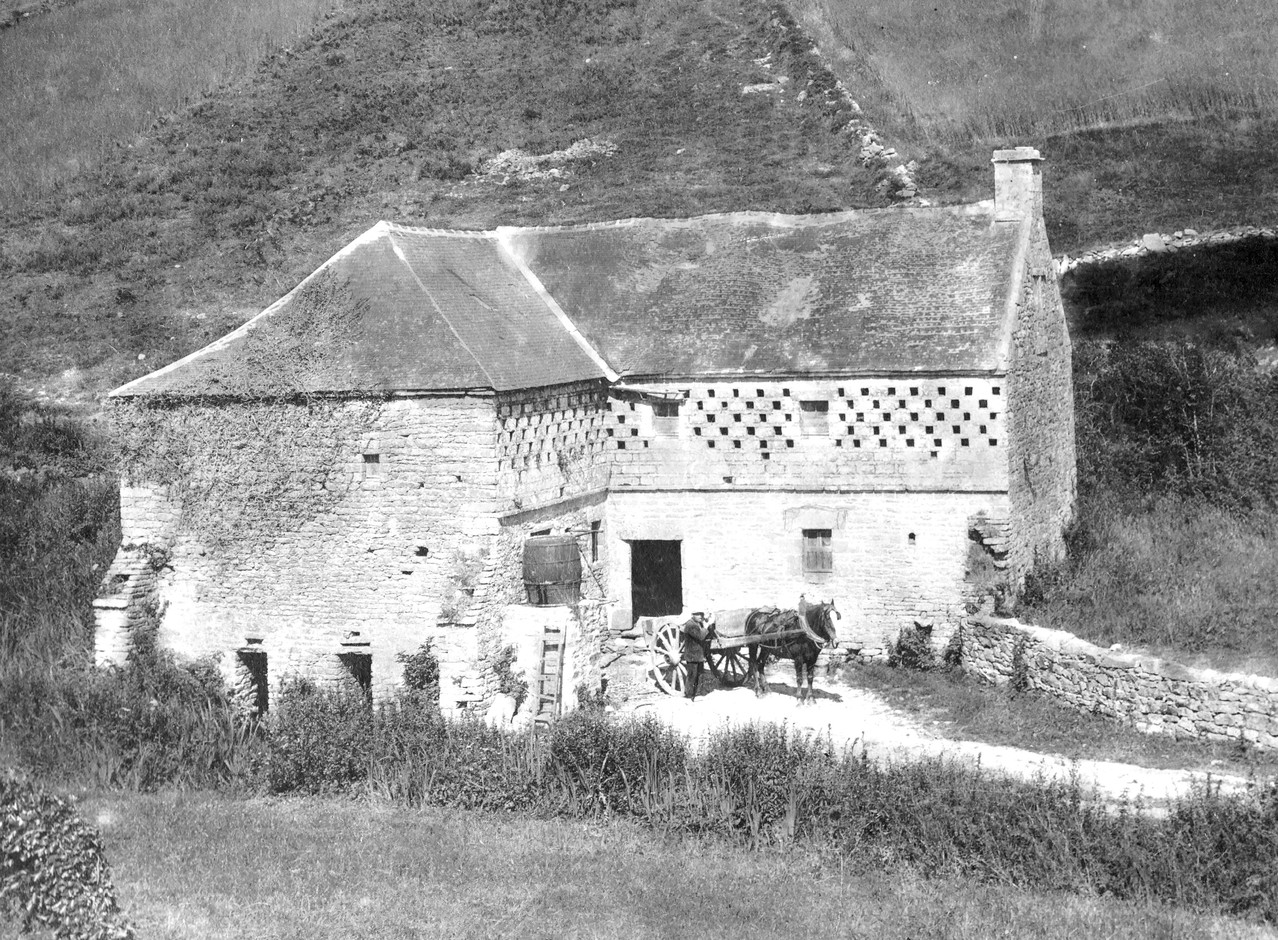 Ensemble moulin, logis et pigeonnier vers 1950. Vue générale prise de l'ouest.Immatriculation