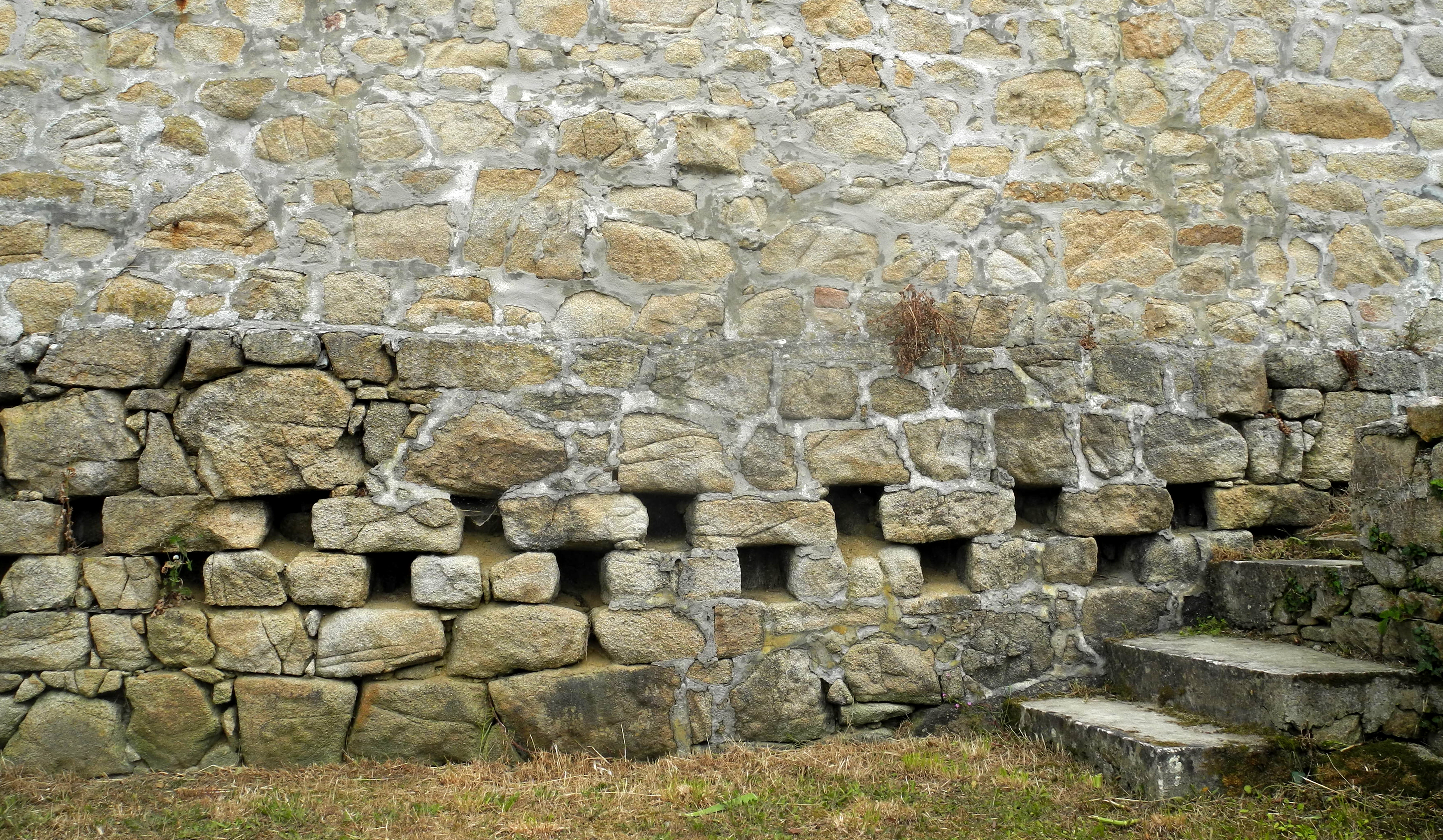 Façade ouest, détail des "orifices" à la base du mur. (2020)Immatriculation