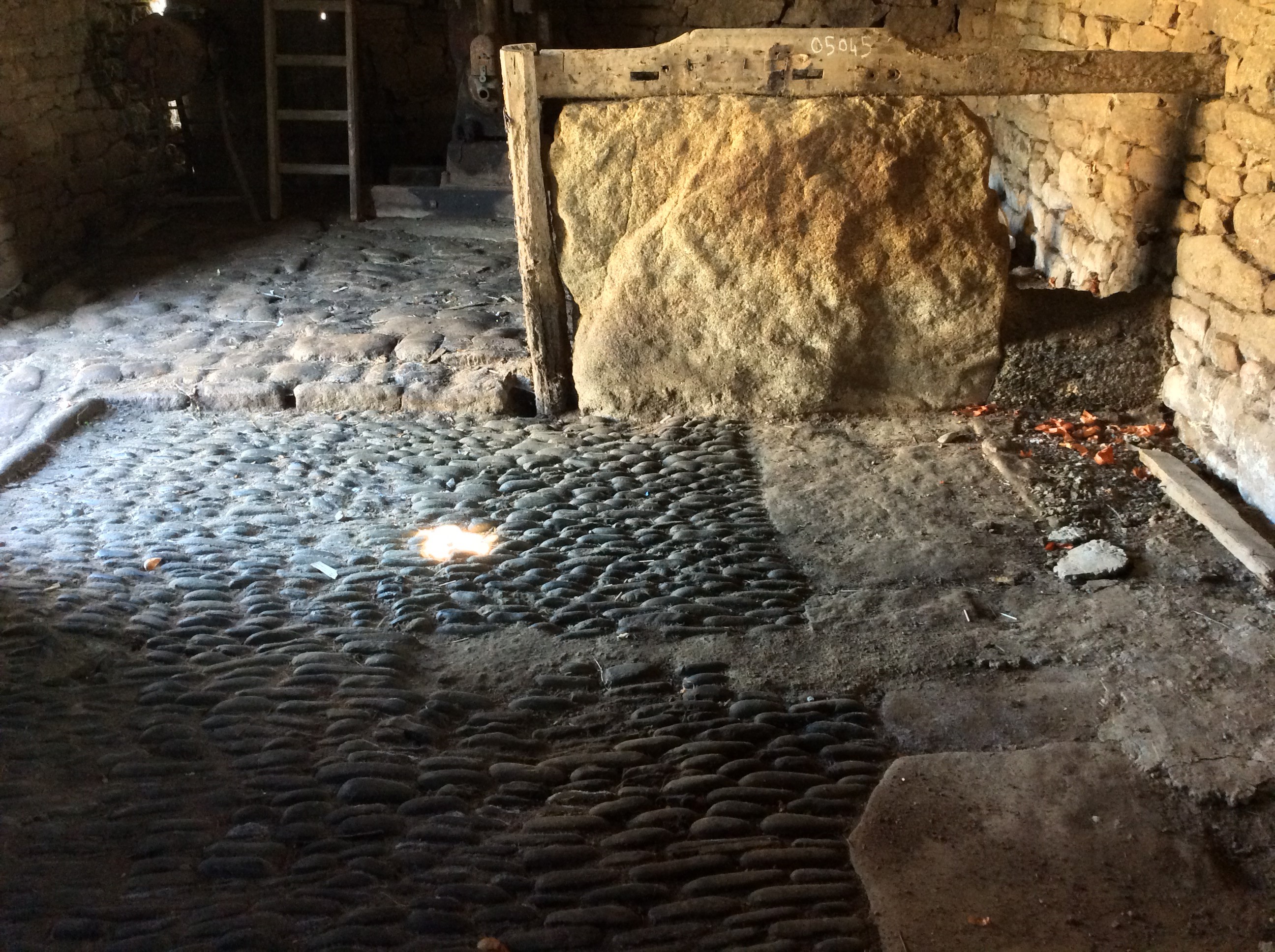 Kerdréal, ferme 3, écurie. Détail du sol en galets de mer sur champ.Immatriculation
